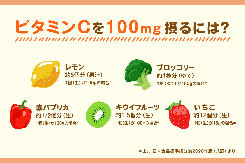 加熱や長期保存によってビタミンCは失われやすいため、できるだけ新鮮な状態で摂取することが望ましいとされています。